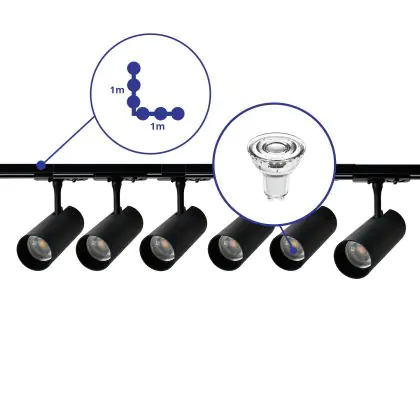 Beschrijving Bright Choice Complete Set 1-Fase Rail L 1 x 1 Meter Zwart | incl. 6x Spot + GU10 2700K 3W Dimbaar + Eindkap, Voedingsconnector en L -Verbindingsstuk