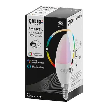 Je kunt er ook voor kiezen om meerdere Calex smart lampen te koppelen aan onder andere een Google Home of Amazon Alexa apparaat. Dit maakt het mogelijk om Calex verlichting via jouw eigen stemgeluid te bedienen. Door het geven van simpele instructies als; ‘Hey Google, dim de lamp eettafel’, heb je dit al snel geregeld! Tevens is deze kaarsvormige E14 Calex Smart verlichting te bedienen via een officiële Calex Smart afstandsbediening. Verder werkt deze Calex lamp op een wandschakelaar, maar niet op een dimmerschakelaar. Ben je op zoek naar Smart verlichting met bijvoorbeeld een andere fitting of in een andere vorm? Klik dan hier om ons volledige assortiment te bekijken!