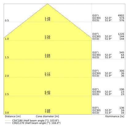 De gradenbundel geeft informatie over hoe breed het licht wordt uitgestraald. Dit zit tussen de 0 en 360 graden (D). Hoe kleiner de hoek, hoe specifieker de lichtbundel is. Over het algemeen is een smalle gradenbundel perfect voor sfeer- of accentverlichting, terwijl een brede gradenbundel ideaal is om grote oppervlaktes te verlichten.