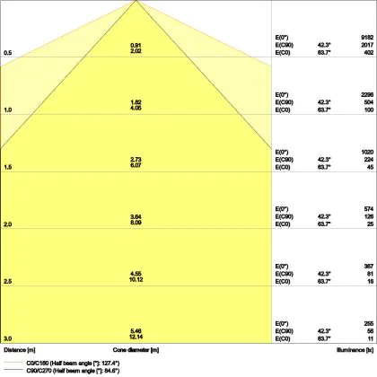 De gradenbundel geeft informatie over hoe breed het licht wordt uitgestraald. Dit zit tussen de 0 en 360 graden (D). Hoe kleiner de hoek, hoe specifieker de lichtbundel is. Over het algemeen is een smalle gradenbundel perfect voor sfeer- of accentverlichting, terwijl een brede gradenbundel ideaal is om grote oppervlaktes te verlichten.