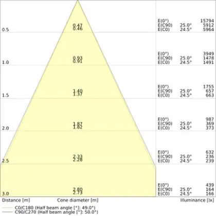 De gradenbundel geeft informatie over hoe breed het licht wordt uitgestraald. Dit zit tussen de 0 en 360 graden (D). Hoe kleiner de hoek, hoe specifieker de lichtbundel is. Over het algemeen is een smalle gradenbundel perfect voor sfeer- of accentverlichting, terwijl een brede gradenbundel ideaal is om grote oppervlaktes te verlichten.