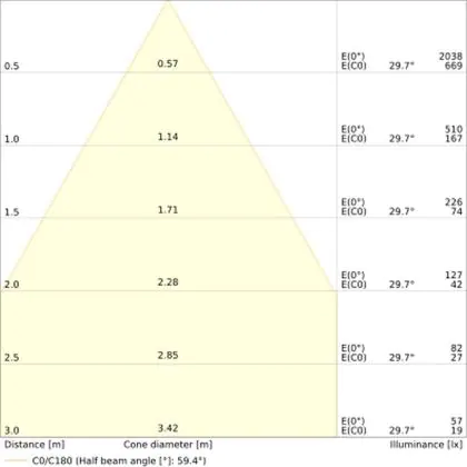 De lichtopbrengst en de gradenbundel spelen een grote rol. Zo geeft de lichtopbrengst van 560 Lumen in combinatie met de 60° stralingshoek deze inbouwspot een specifieke toepassing. Kort samengevat is een lichtintensiteit van maximaal 400 Lumen ideaal voor accentverlichting, terwijl hogere waardes goed gebruikt kunnen worden als basisverlichting. Over het algemeen geldt: hoe breder de gradenbundel, hoe geschikter deze is door basisverlichting. Dit komt doordat het licht over een groter oppervlak wordt verspreid. Smallere gradenbundels (tot 40°) kunnen echter bij hoge plafonds ook goed tot hun recht komen als algemene verlichting.
