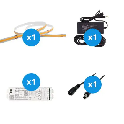 Het grote voordeel van deze complete set is dat je alle accessoires hebt die je nodig hebt om de beste lichtaccenten voor je huis of bedrijfspand te creëren. Je hoeft niet op zoek te gaan naar de juiste apparatuur; je hoeft alleen maar alle elementen met elkaar te verbinden. Daarna steek je de stekker in het stopcontact in je huis. Je kunt hier alles over lezen in onze installatieblog. Deze set bevat een: